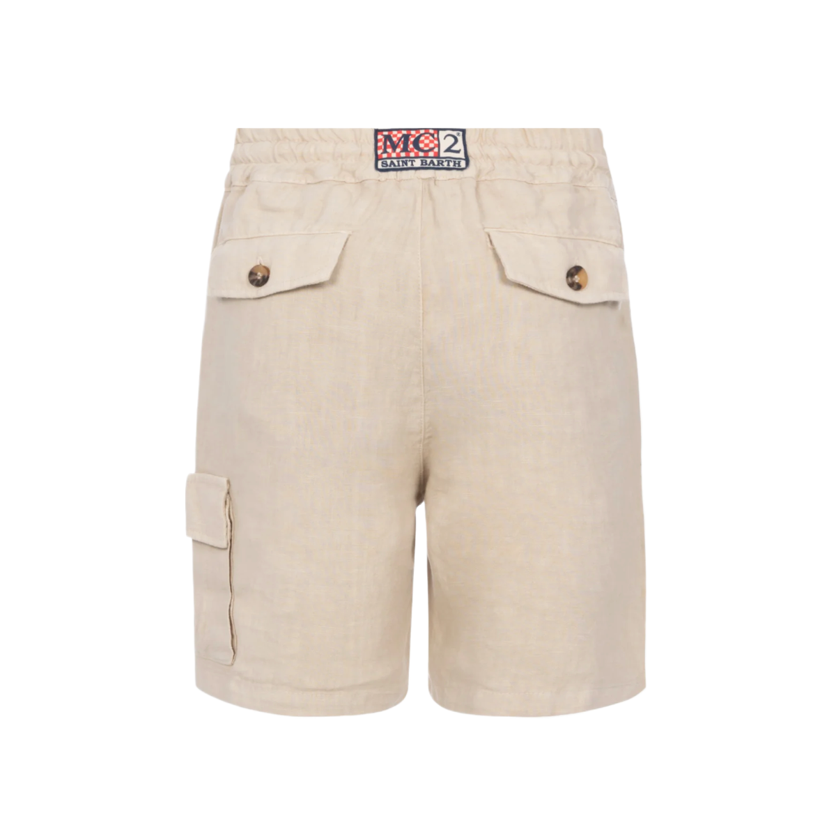 Introducing Marseille Jr, the perfect blend of style and comfort. These boy's linen bermuda shorts feature an elasticized waistband with a drawstring for a secure fit. Designed for functionality, they include side pockets, a utility pocket on the left leg, and back pockets with flaps and button closures. The hidden button front closure ensures a seamless look, while the branded label on the back adds a refined touch.
