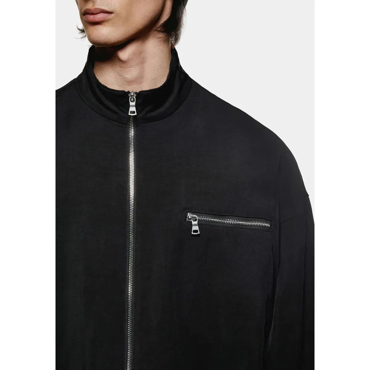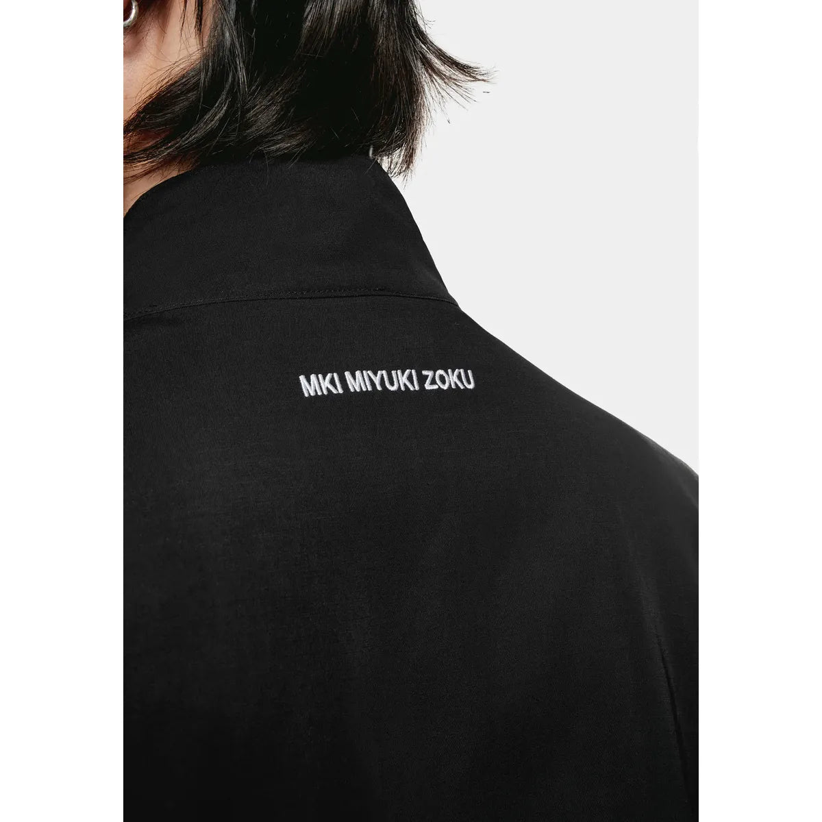 MKI VISCOSE LINEN TRACK JACKET IN BLACK. THE VISCOSE LINEN BLEND COMBINES THE SMOOTH FEEL OF VISCOSE WITH THE NATURAL TEXTURE AND BREATHABILITY OF LINEN, OFFERING A BALANCE OF MODERN, CLEAN LINES AND PERFECT COMFORT. THE VISCOSE LINEN TRACK JACKET REIMAGINES THE TRADITIONAL MKI TRACK JACKET SILHOUETTE FOR SS25, FEATURING A FLUID DRAPE AND MODERN SHEEN THAT ELEVATES IT INTO A STAPLE EVENING PIECE.