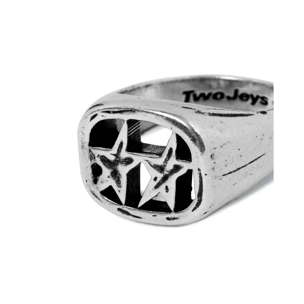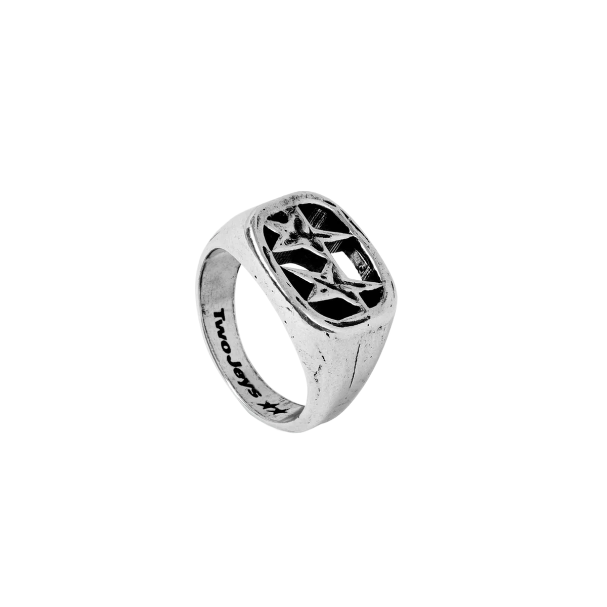The Framed Ring is made of a brass base with etched icon stars in the main face of the ring.
